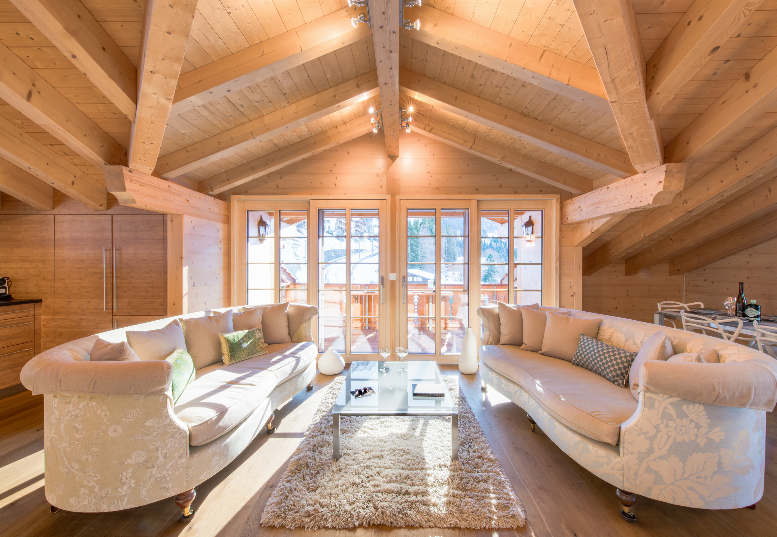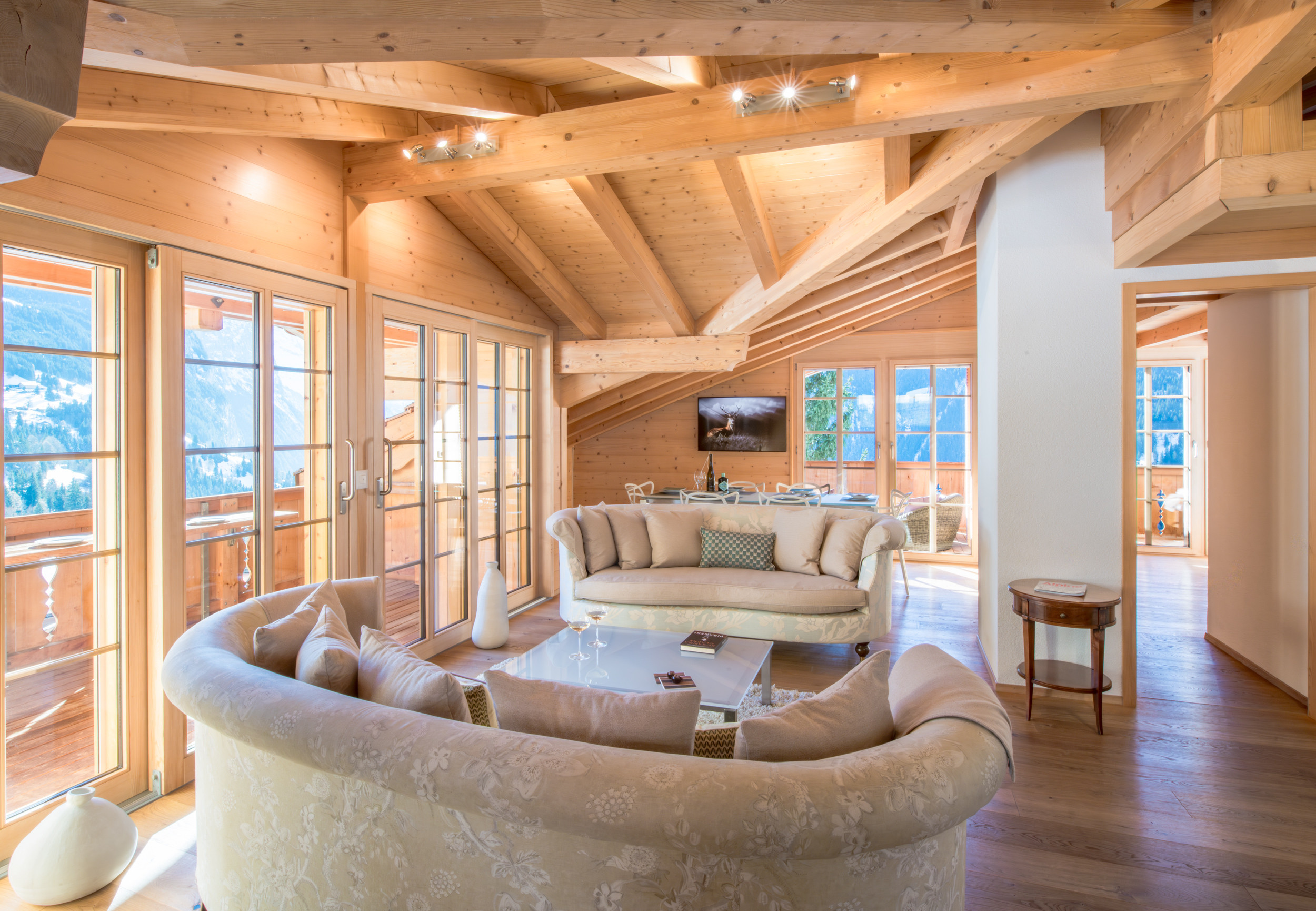 Vom Boden bis zur Decke reichende Fenster und Schiebetüren, traditionelle Holzbalken und hochwertige Möbel machen diesen alpinen Urlaubsort beeindruckend. Zwei Sofas im klassischen Stil stehen im Mittelpunkt des Wohnbereichs. Der Essbereich mit grossem Glastisch und Designerstühlen befindet sich am nächsten zum Westbalkon und eignet sich hervorragend für Unterhaltungs- oder Familienessen.