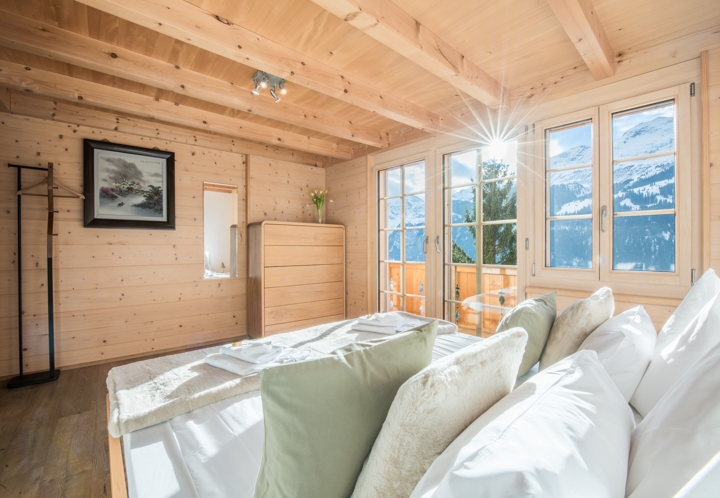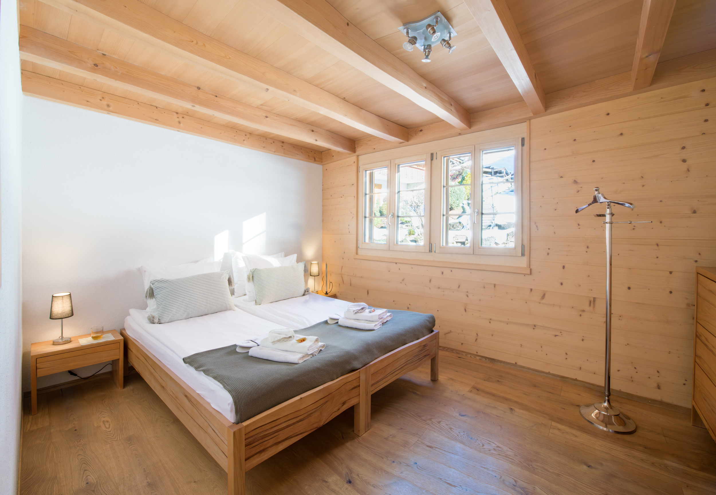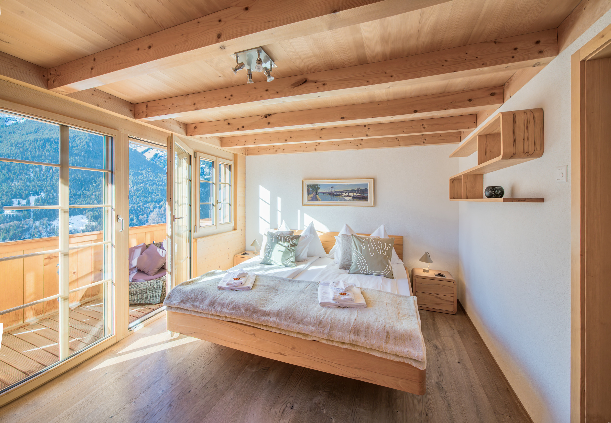 Hauptschlafzimmer: Dieses Schlafzimmer bietet Zugang zum grossen, nach Westen ausgerichteten Holzbalkon mit freiem Blick und verfügt über ein extra grosses Doppelbett (200 x 200 cm) in einem handgefertigten Schweizer Holzrahmen, passende Schubladen, handgefertigte Nachttische, Regale und Originalgemälde aus Japan und Grossbritannien. •