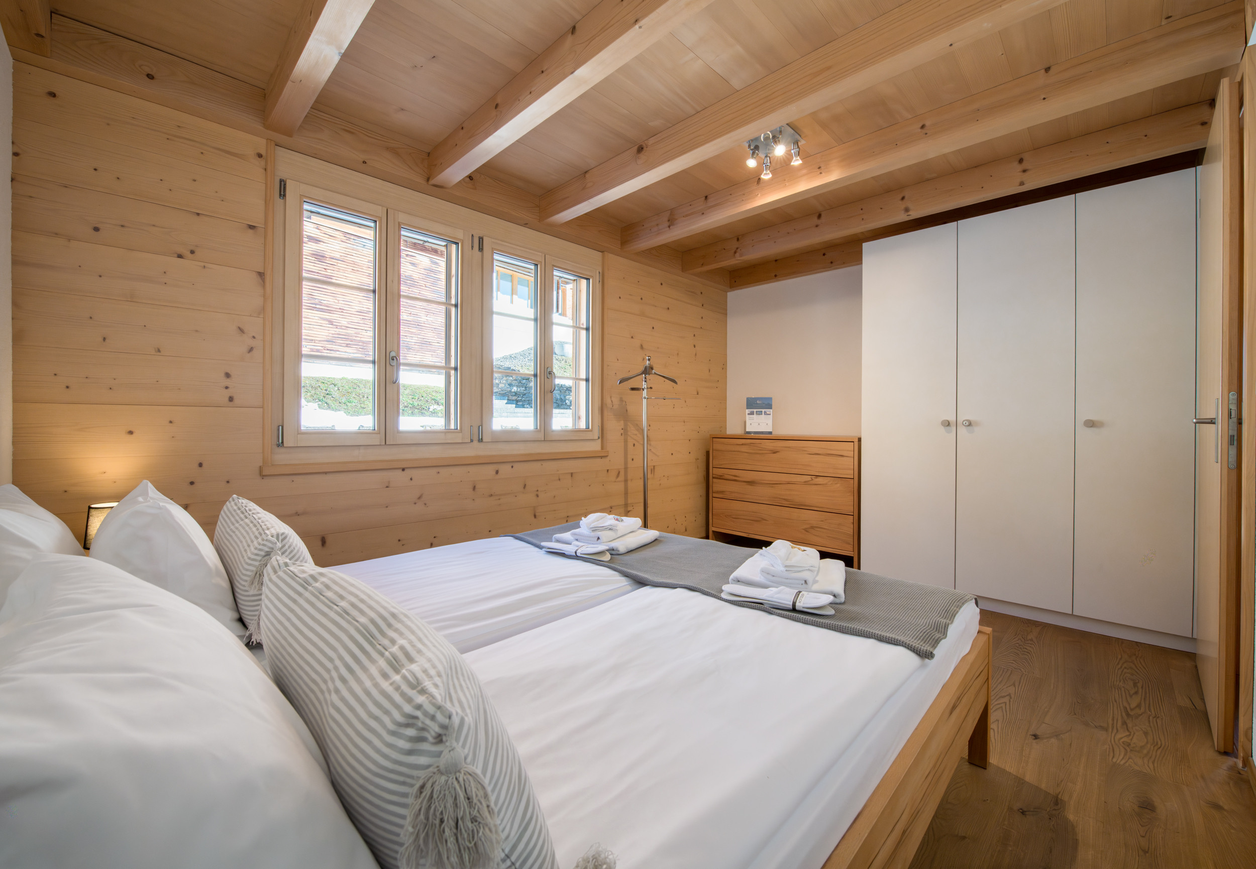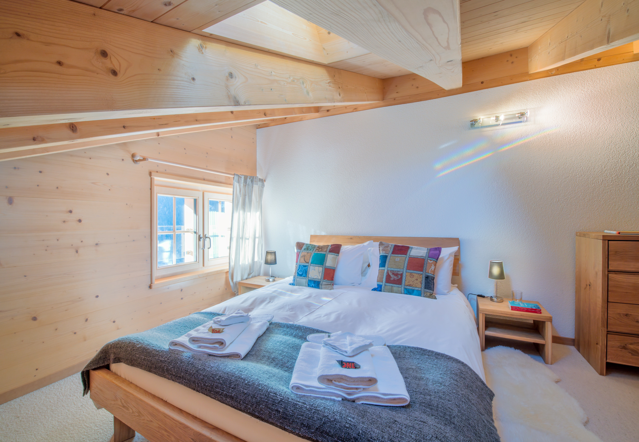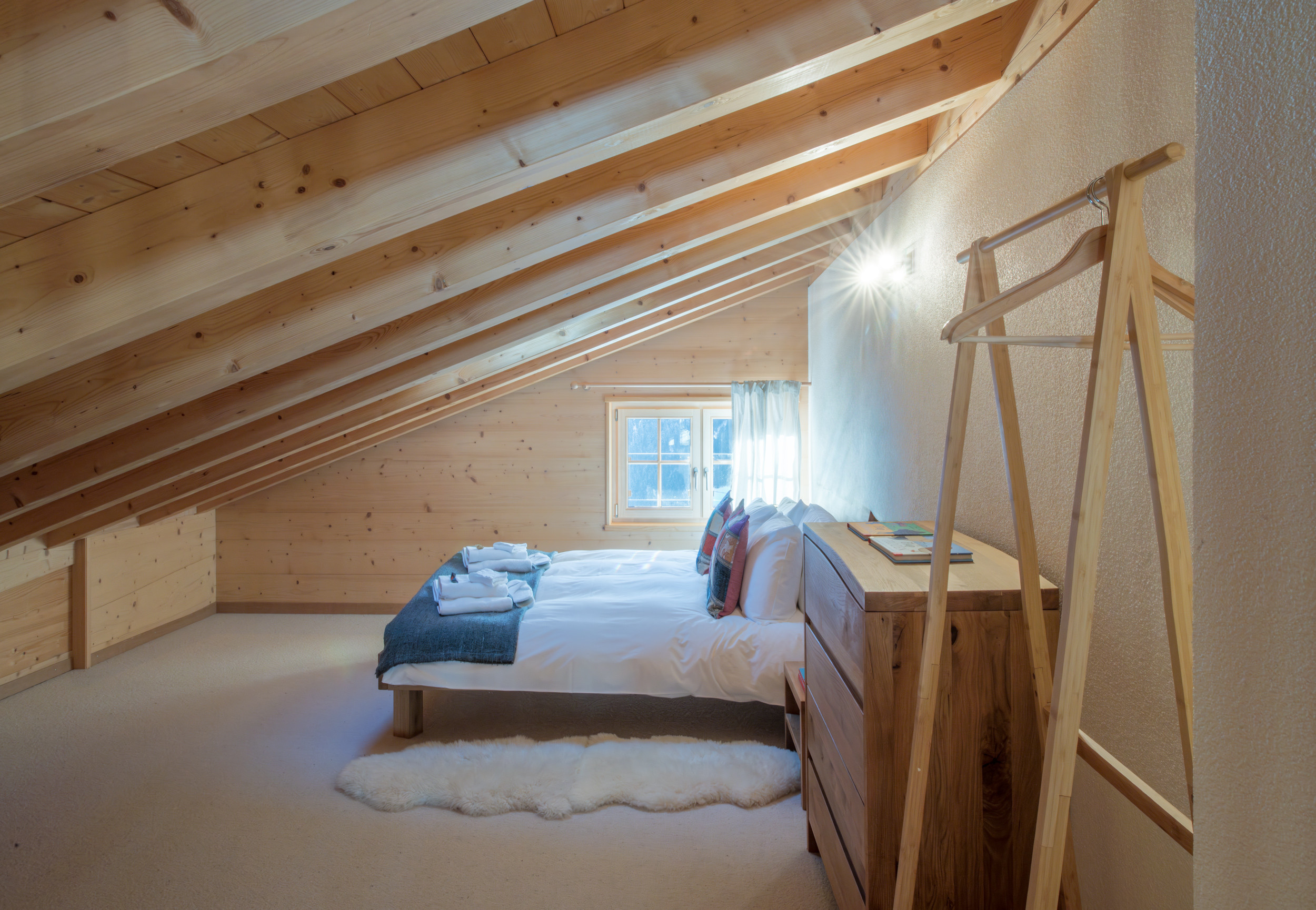 Hauptschlafzimmer: Dieses Schlafzimmer bietet Zugang zum grossen, nach Westen ausgerichteten Holzbalkon mit freiem Blick und verfügt über ein extra grosses Doppelbett (200 x 200 cm) in einem handgefertigten Schweizer Holzrahmen, passende Schubladen, handgefertigte Nachttische, Regale und Originalgemälde aus Japan und Grossbritannien. •