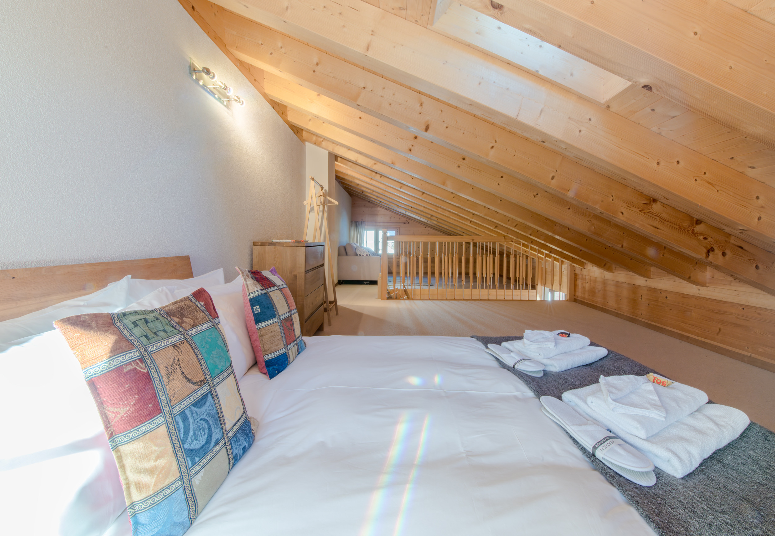 Die Wohnung mit offenem Wohnkonzept, 2 Doppelzimmern, einem 3. Galerie-Schlafzimmer und 2 Duschräumen bietet bequem Platz für bis zu 6 Personen. Das Hauptschlafzimmer mit Zugang zum nach Westen ausgerichteten Balkon ist aufwendig verarbeitet und verfügt über Fenster im klassischen Stil, ein 200 x 200 cm grosses Doppelbett und ein eigenes Bad mit ebenerdiger Dusche und WC. Das zweite Schlafzimmer bietet 2 Einzelbetten und das Schlafzimmer mit offener Galerie verfügt über ein Queensize-Doppelbett (160 x 200 cm). Es gibt ein zweites Badezimmer mit ebenerdiger Dusche und WC. Der obere Galerieraum ist über eine herunterziehbare Holztreppe zugänglich.