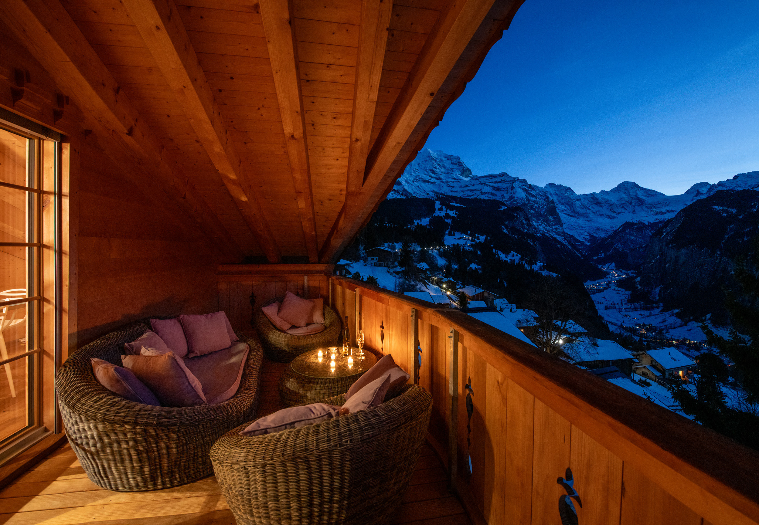Südbalkon: Geniessen Sie das Abendessen im Freien am grossen Holztisch mit freiem Blick auf die berühmte 4000 m hohe Jungfrau und das Silberhorn. •
