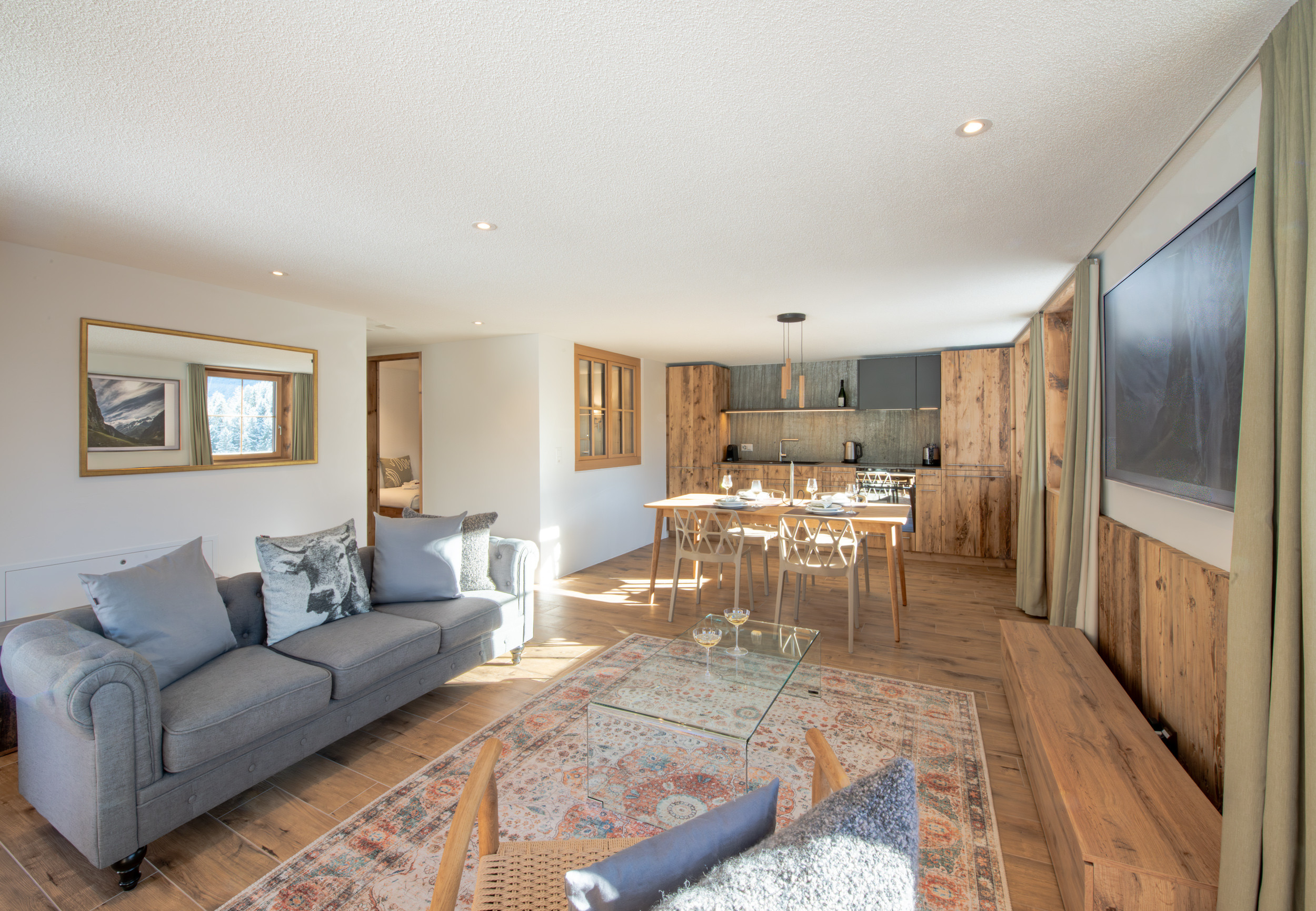 • Ein heller, offener Wohn-Ess-Küchenbereich mit stilvollem Alpenmobiliar