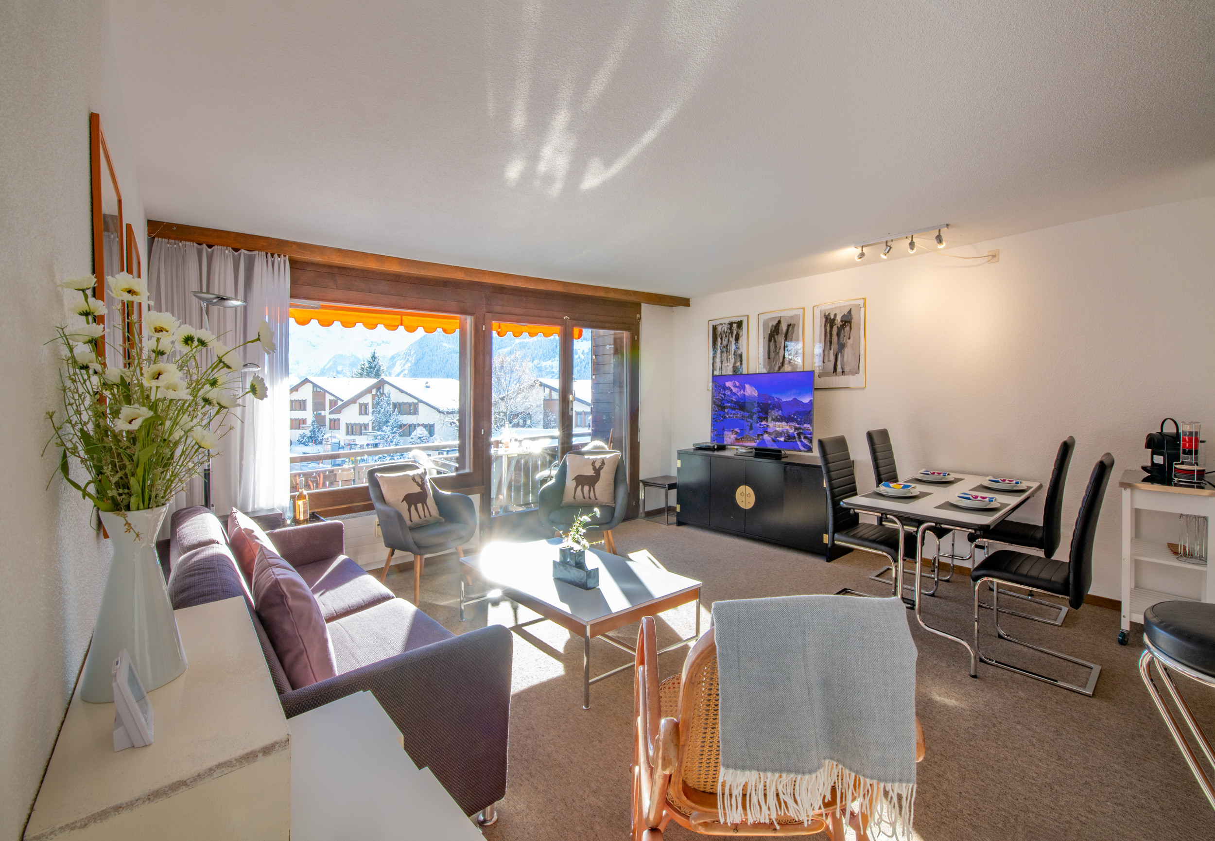 Der Teppichboden im Wohnbereich ist sehr kinderfreundlich und bietet Platz für 4 Personen auf dem Sofa und den 2 Einzelsitzen. Von dort gelangen Sie auf den Südbalkon mit Blick auf die Jungfrau, Silberhorn und die umliegenden Berge.