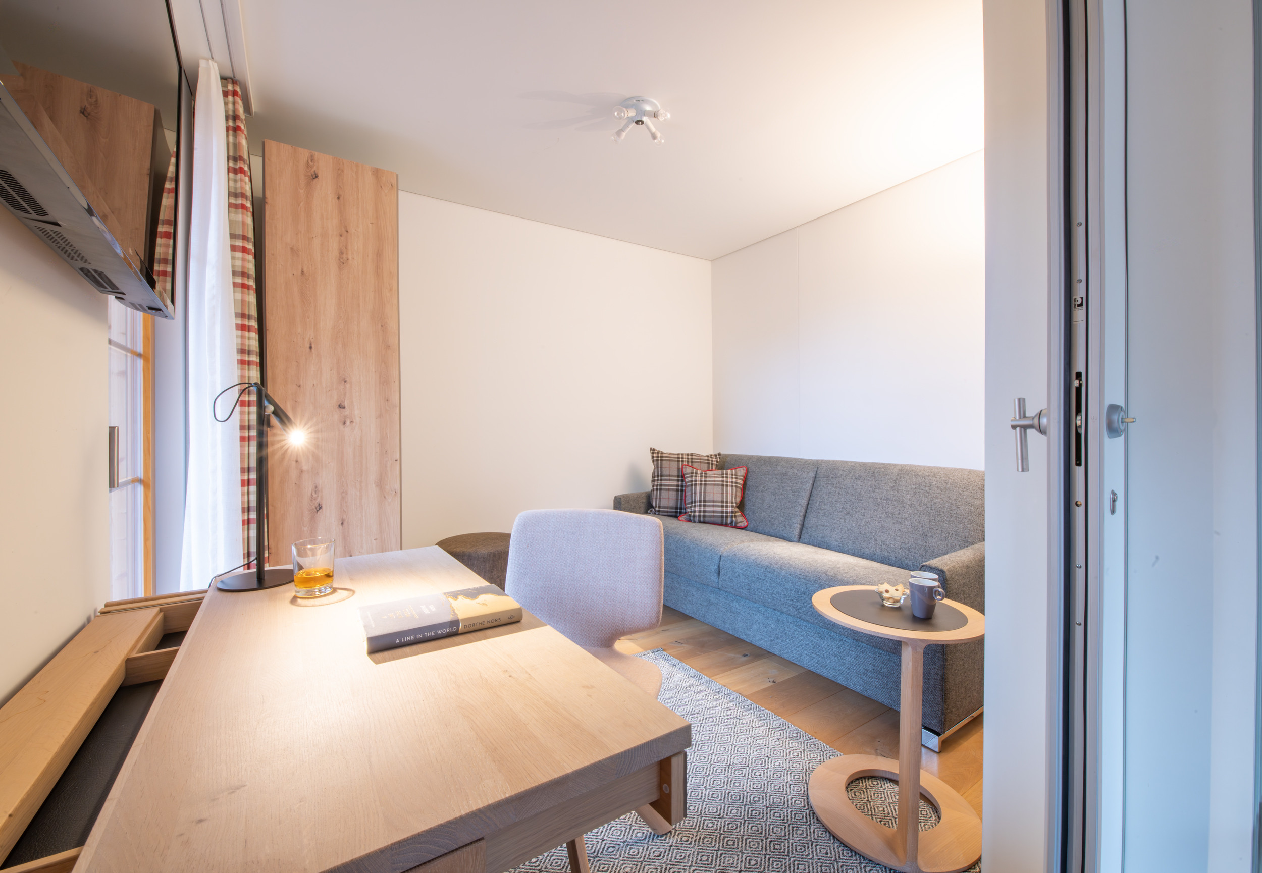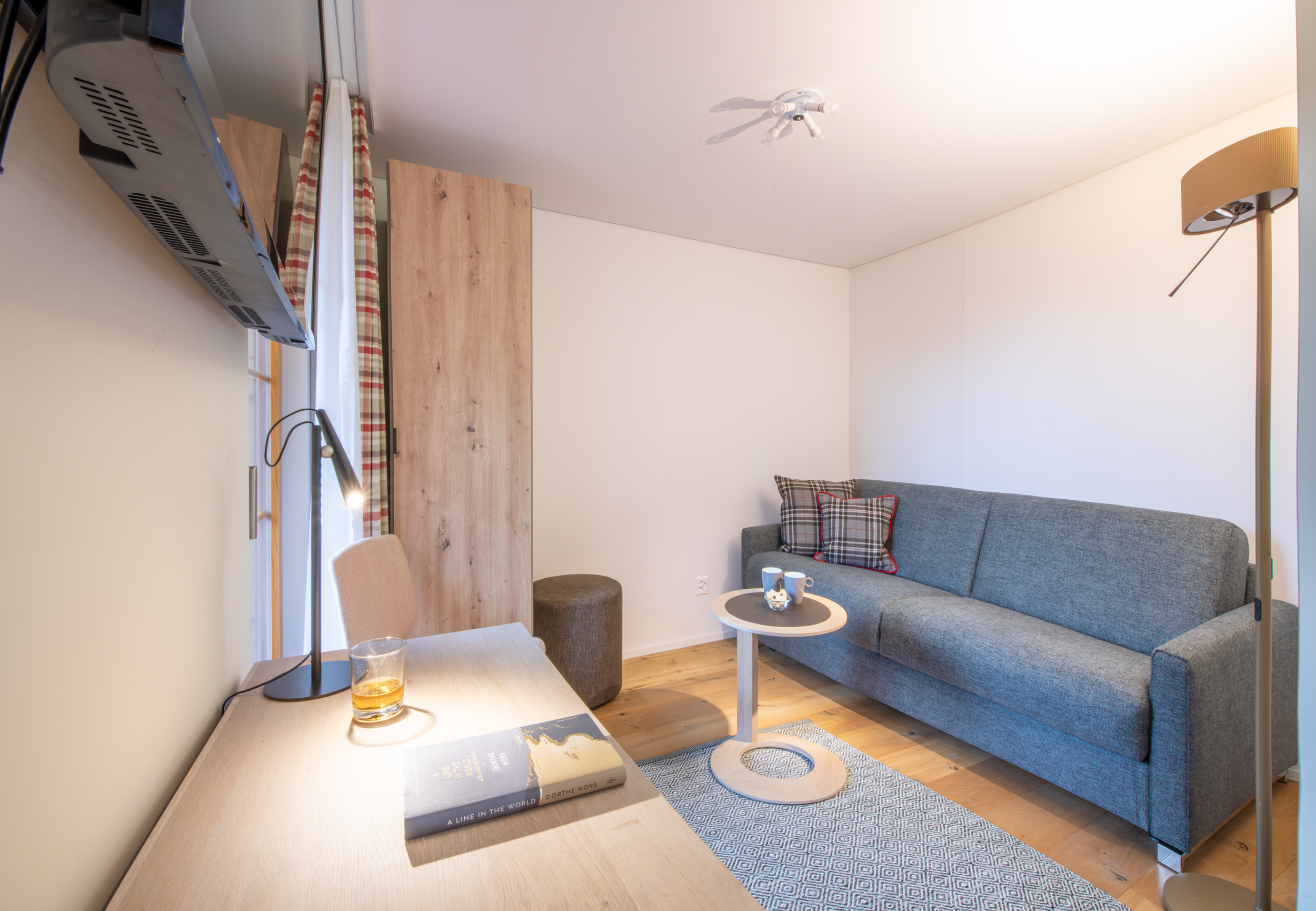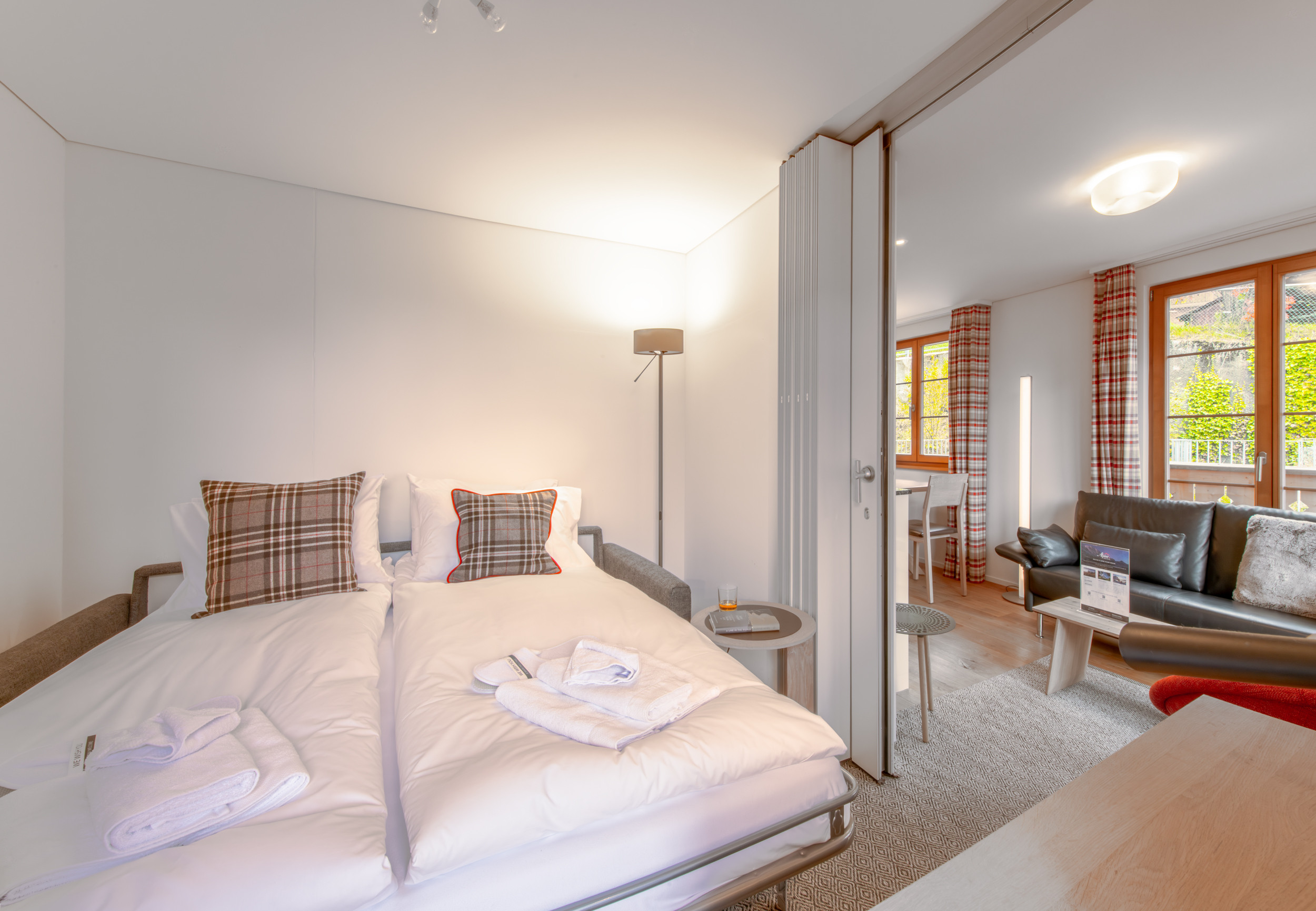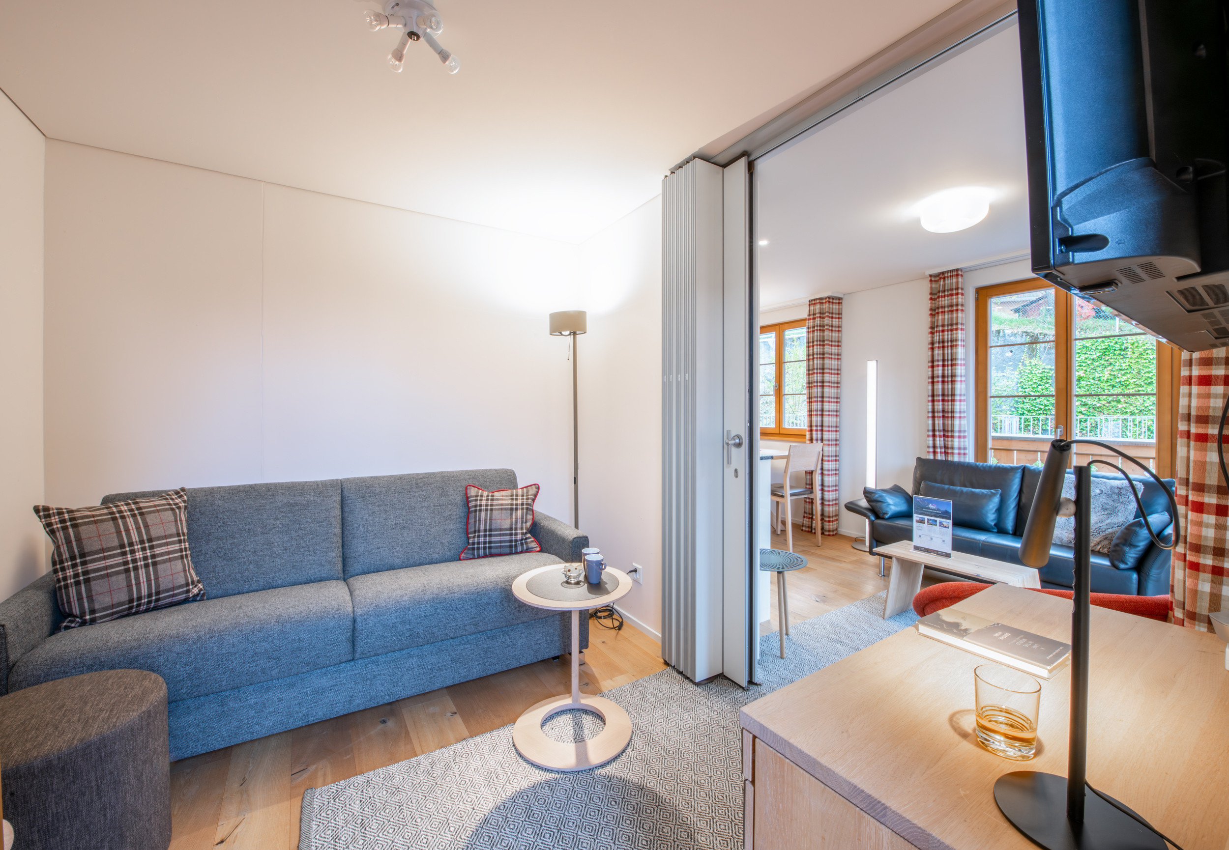 Die offene Wohn-Ess-Küche mit Platz für 4 Personen, Sofa und Sessel verfügt über bodentiefe Türen, die auf einen nach Westen ausgerichteten Balkon führen. Eine Schiebetür ermöglicht es, den Wohnbereich in den Mehrzweckraum zu öffnen, der als zweites Schlafzimmer dient und ein hochwertiges Schlafsofa, Schreibtisch, Fernseher und Kleiderschrank enthält.
