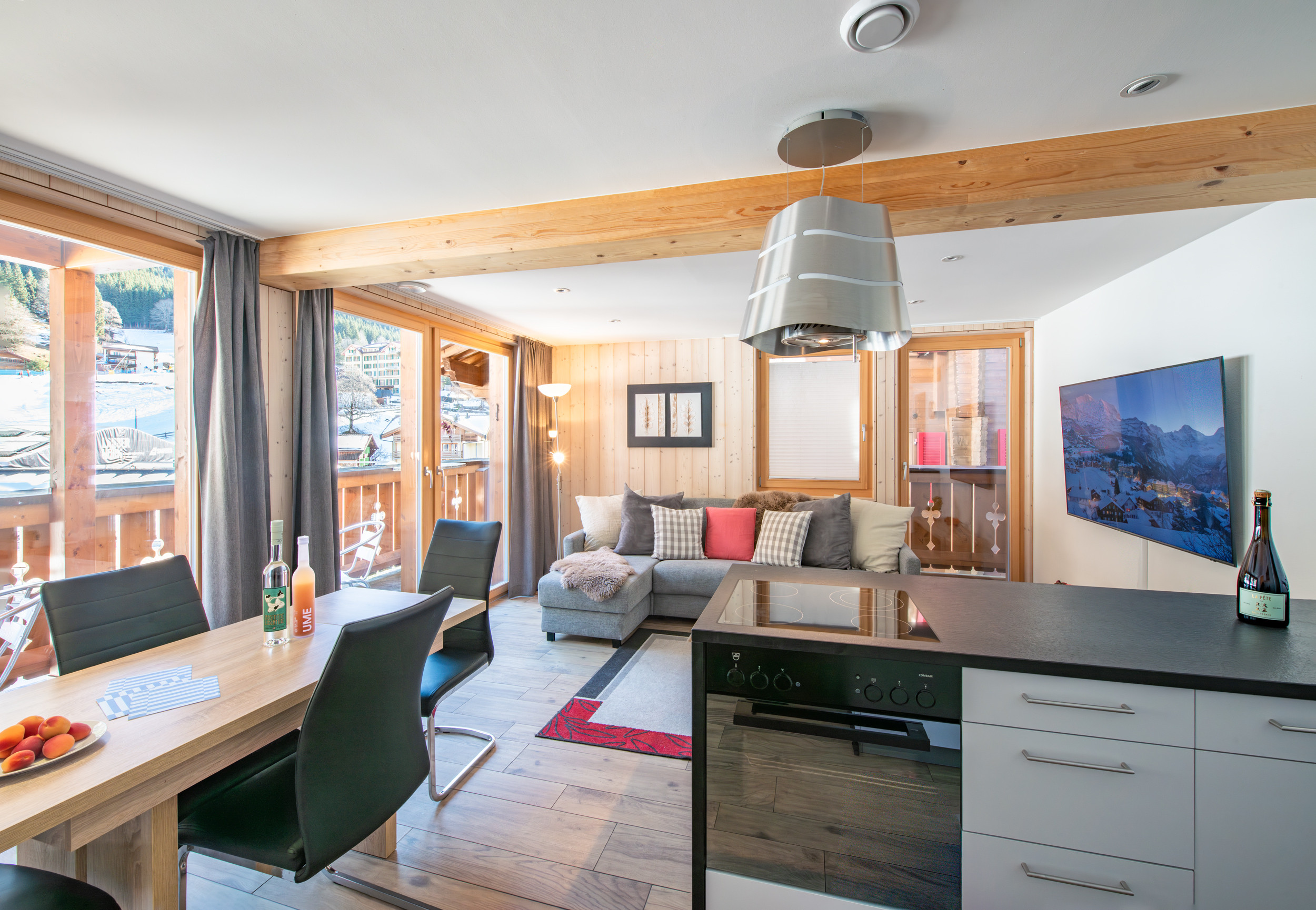 - espace ouvert salon-salle à manger-cuisine, doté de grandes fenêtres panoramiques avec vue sur le sommet Männlichen et les pistes de ski débutantes de Wengen, cuisine bien équipée