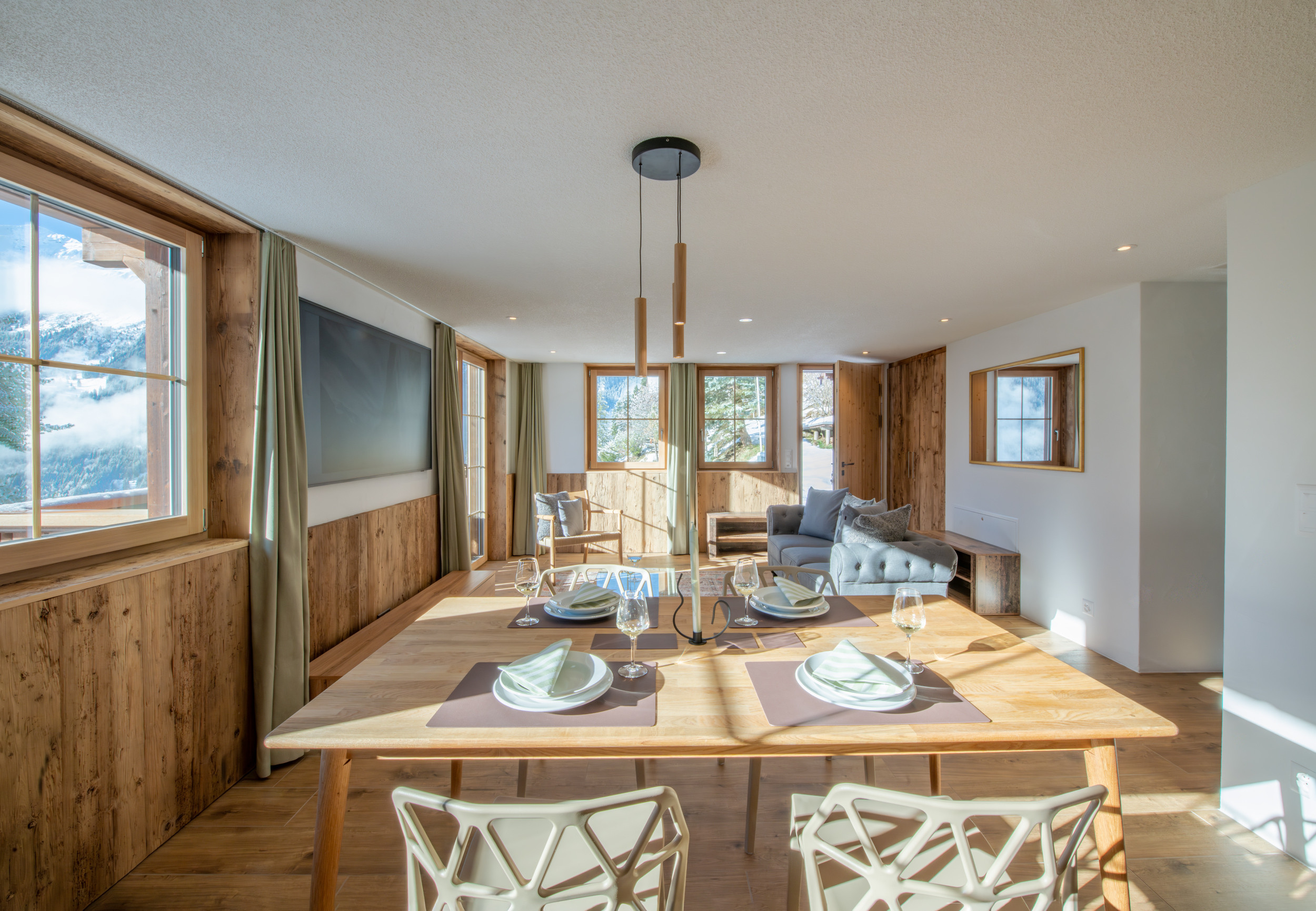 • Un espace de vie-salle à manger-cuisine lumineux et ouvert avec un mobilier alpin élégant