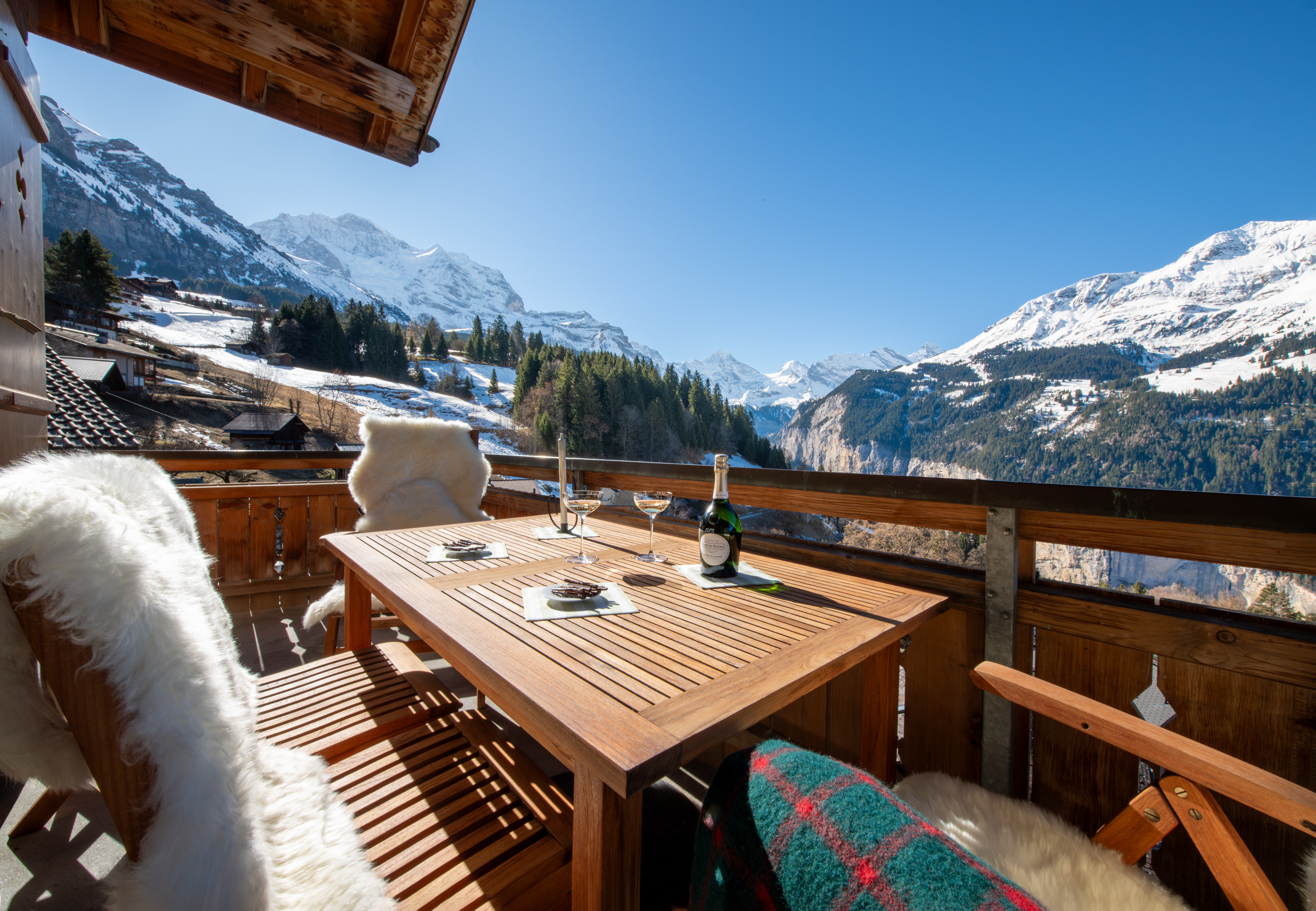 Il y a aussi beaucoup d'espace pour la vie en plein air - détendez-vous sur le balcon ensoleillé orienté au sud-ouest avec un verre de vin après une journée de randonnée ou de ski, tout en vous émerveillant de la vue sur la magnifique vallée de Lauterbrunnen et les montagnes environnantes ! Vous pouvez également dîner en plein air sur la terrasse spacieuse et ensoleillée orientée au sud et profiter de la vue mondialement connue sur la montagne Jungfrau.