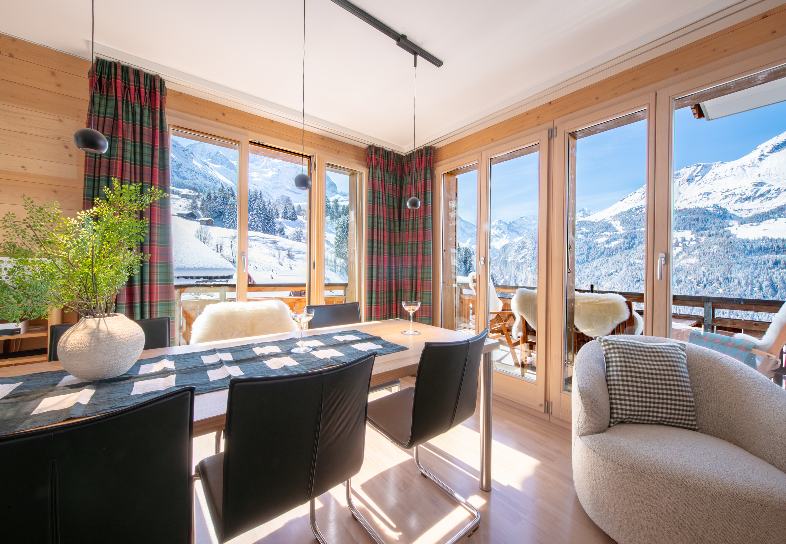 Commencez votre journée avec un petit-déjeuner ensoleillé autour de la table sculptée en bois dans la cuisine-salle à manger bien équipée avec une vue imprenable sur la Jungfrau et le Silberhorn. Celle-ci s'ouvre sur l'espace de vie et de repas, qui est charmant pour se réunir après une journée à l'extérieur, avec un canapé confortable, des fauteuils et un grand espace de repas pour les diners entre amis ou en famille. Un escalier en bois artisanal mène à la mezzanine où se trouvent 2 autres canapés ainsi qu'un téléviseur avec lecteur DVD.
