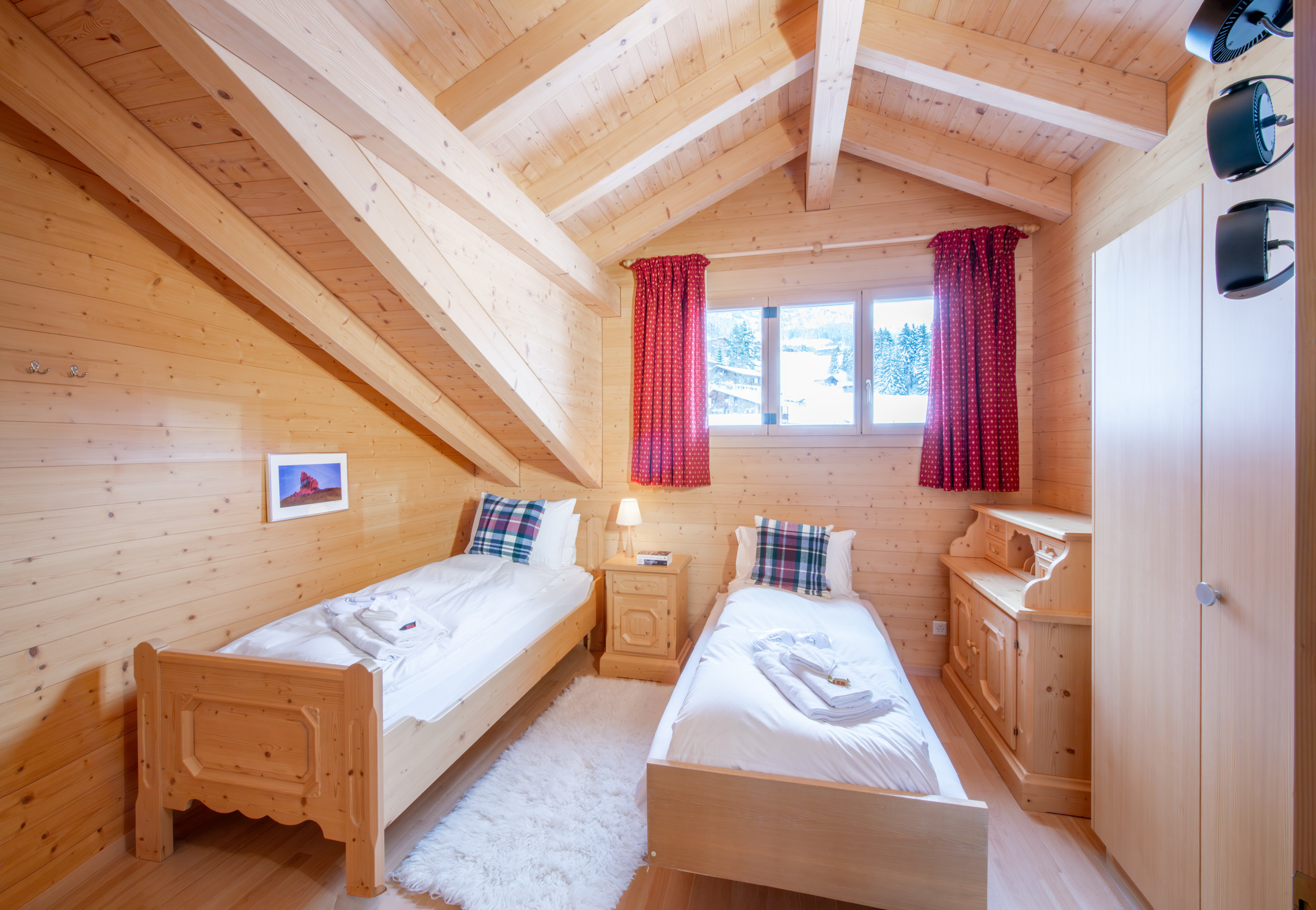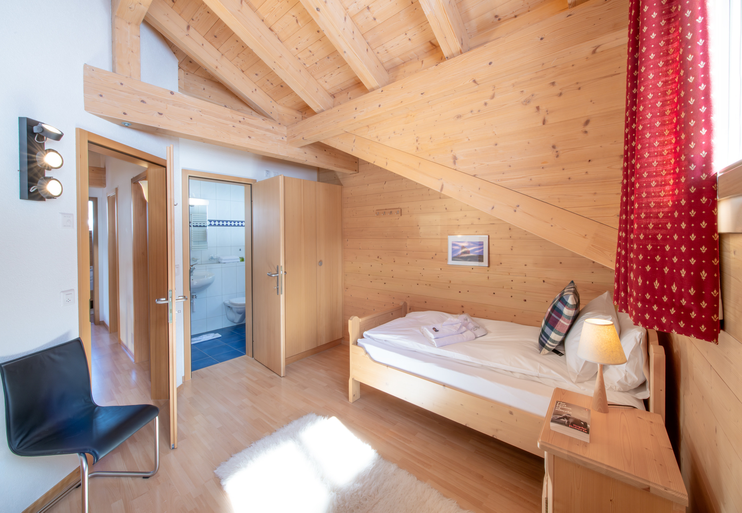 La chambre principale avec dressing offre un accès direct sur le balcon orienté à l'ouest avec vue sur le Lobhorn et les montagnes environnantes et est équipée d'un lit king-size (180x200cm), tandis que la deuxième chambre dispose de 2 lits jumeaux (90x200cm). La troisième chambre spacieuse peut accueillir jusqu'à 4 personnes supplémentaires dans une combinaison de quatre lits (90x200cm).