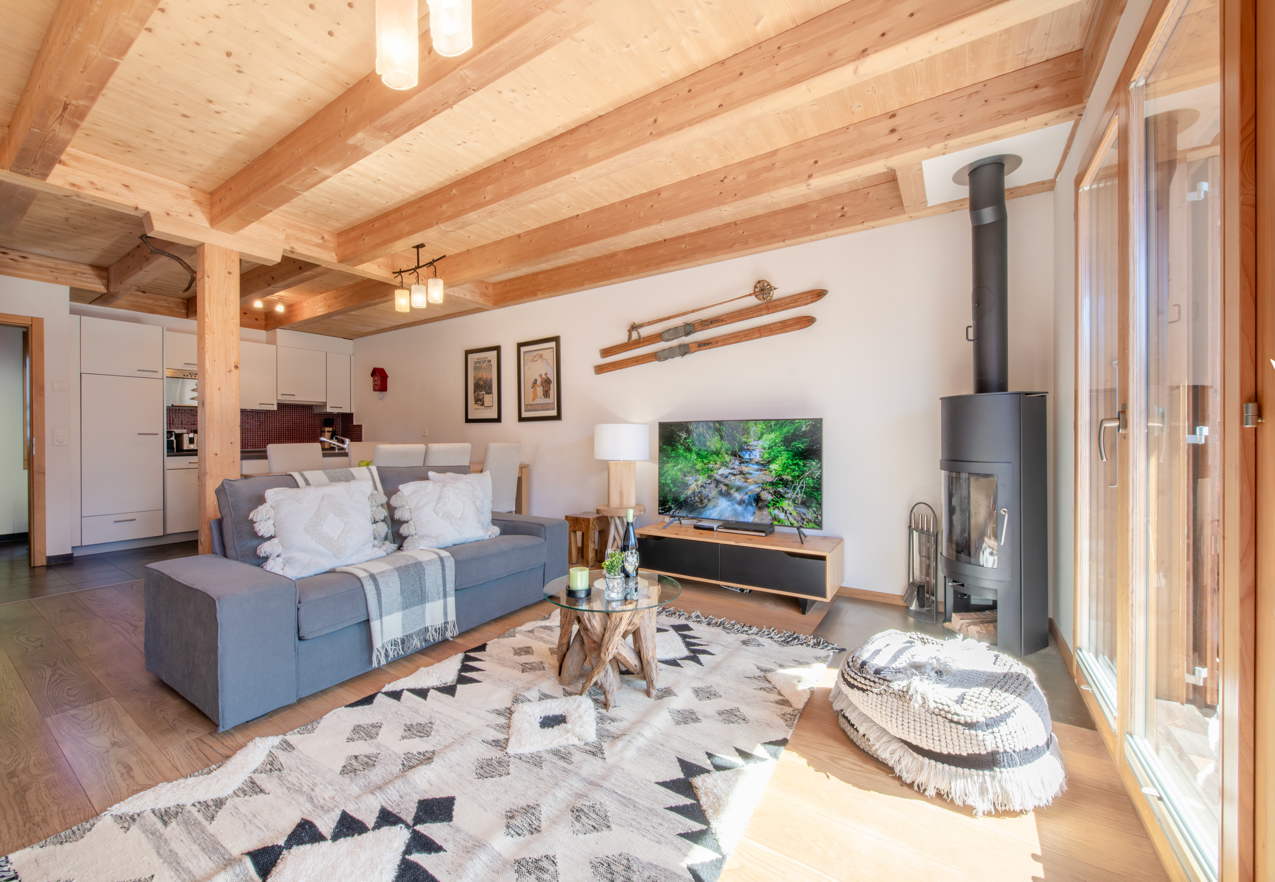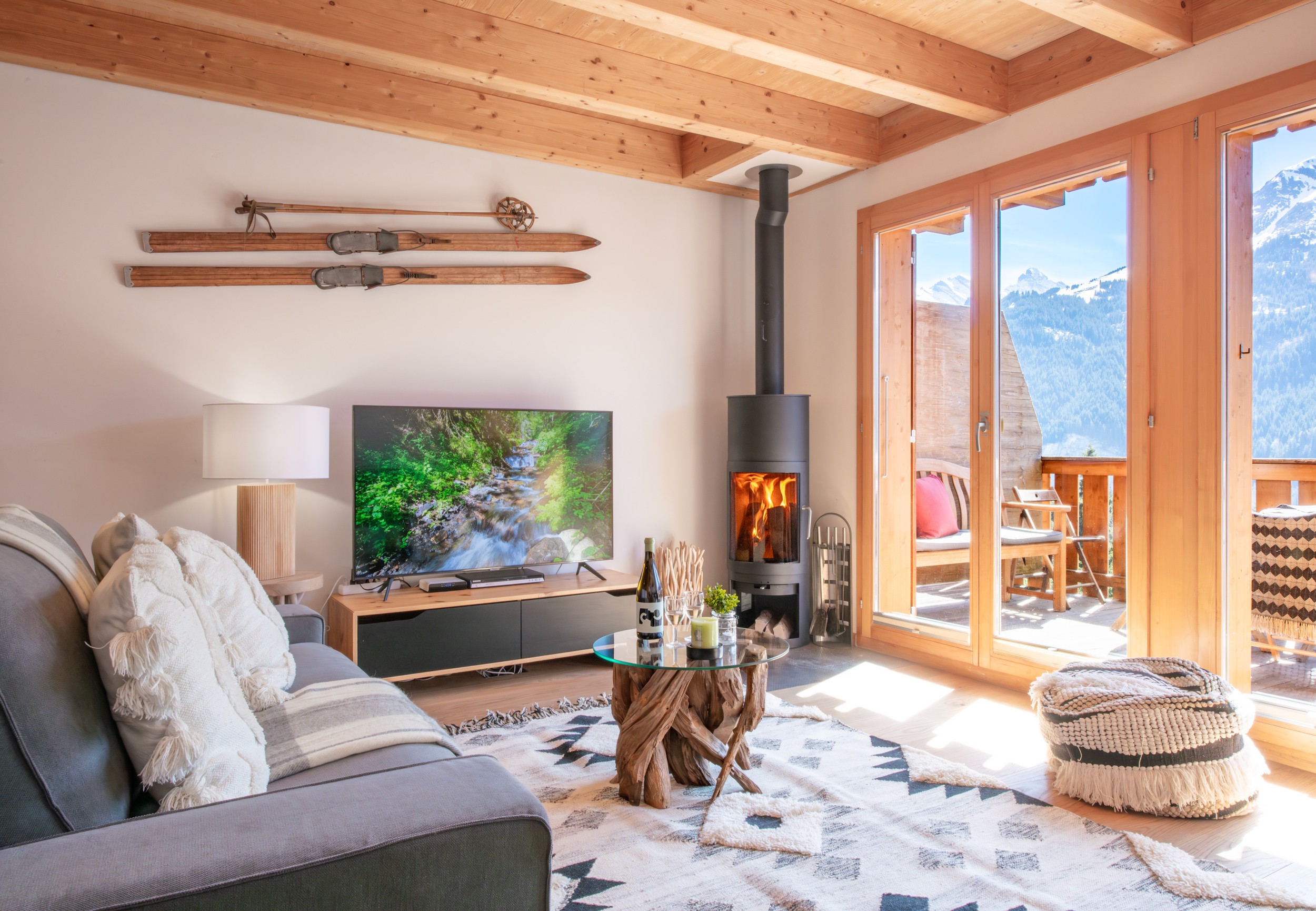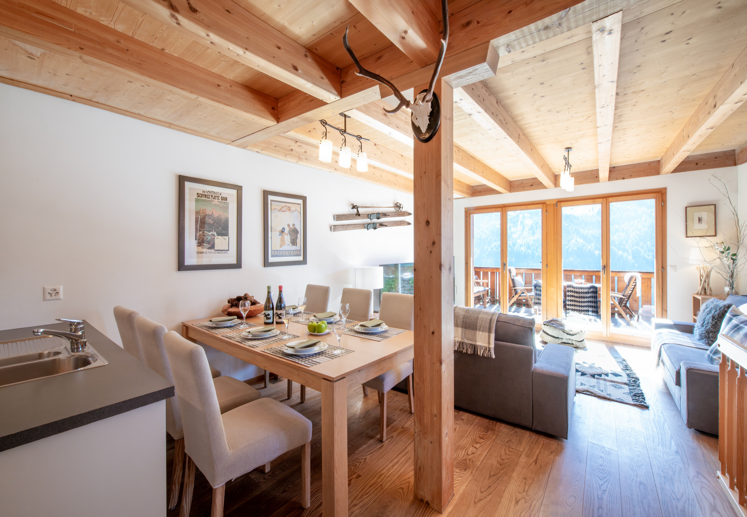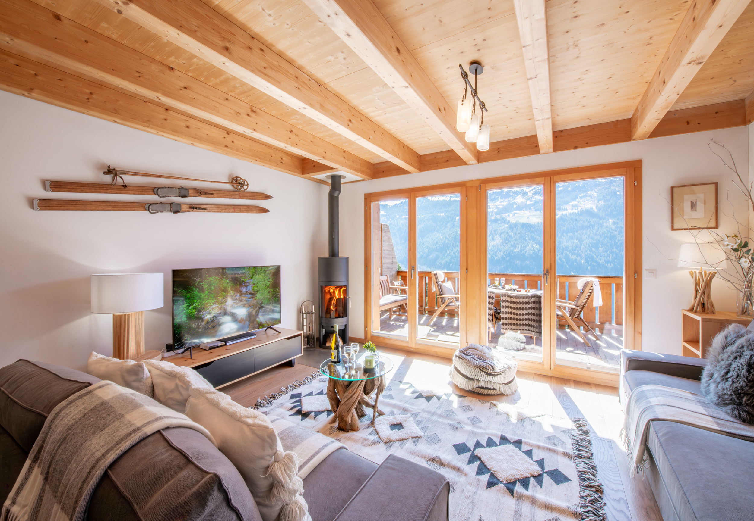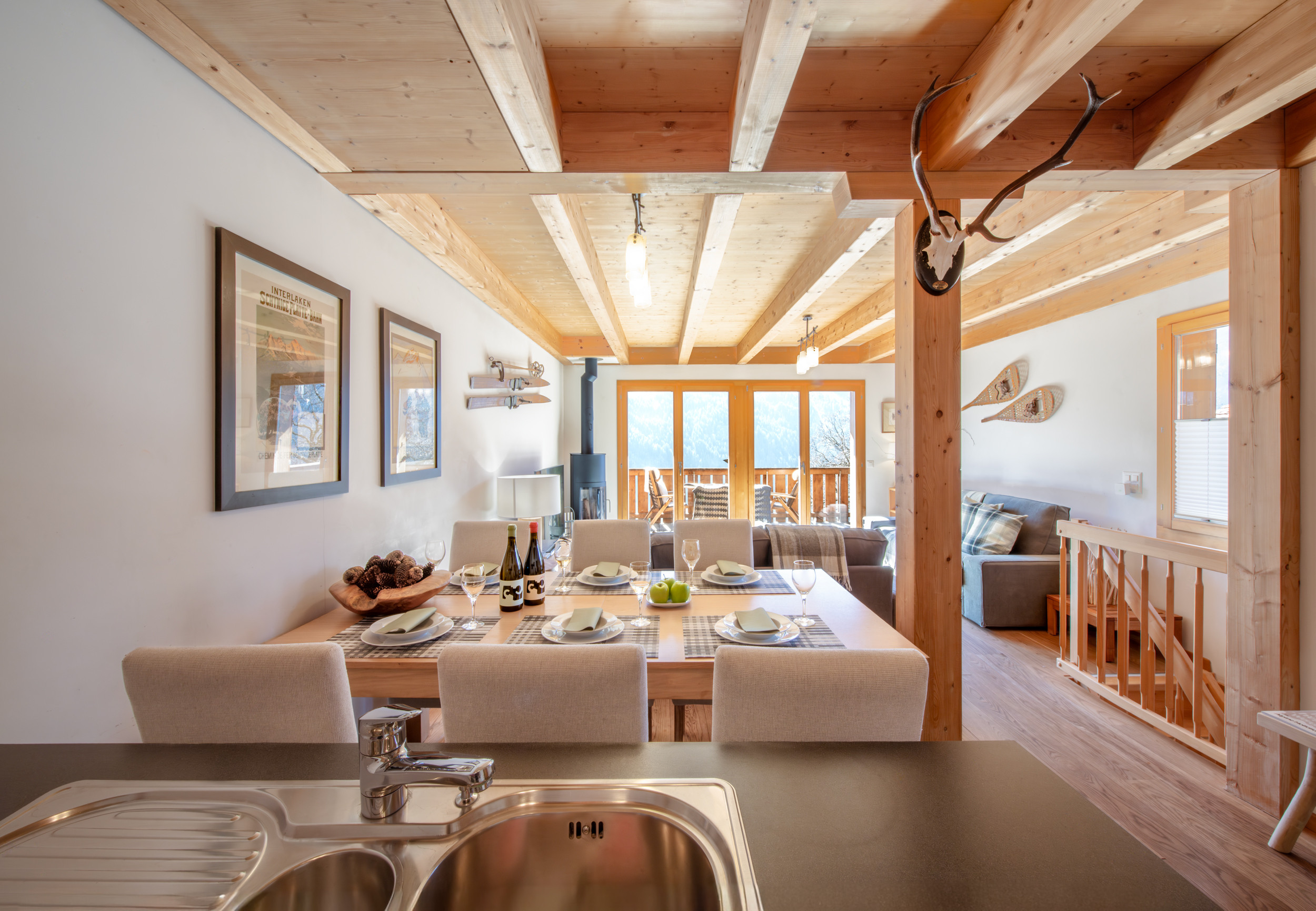 Situé au niveau de l'entrée, l'espace ouvert salon-salle à manger-cuisine est charmant avec ses poutres apparentes et son poêle à bois suédois. Un double jeu de portes vitrées s'ouvre sur le balcon spacieux qui offre beaucoup d'espace pour profiter du plein air et de la belle vue sur les montagnes.