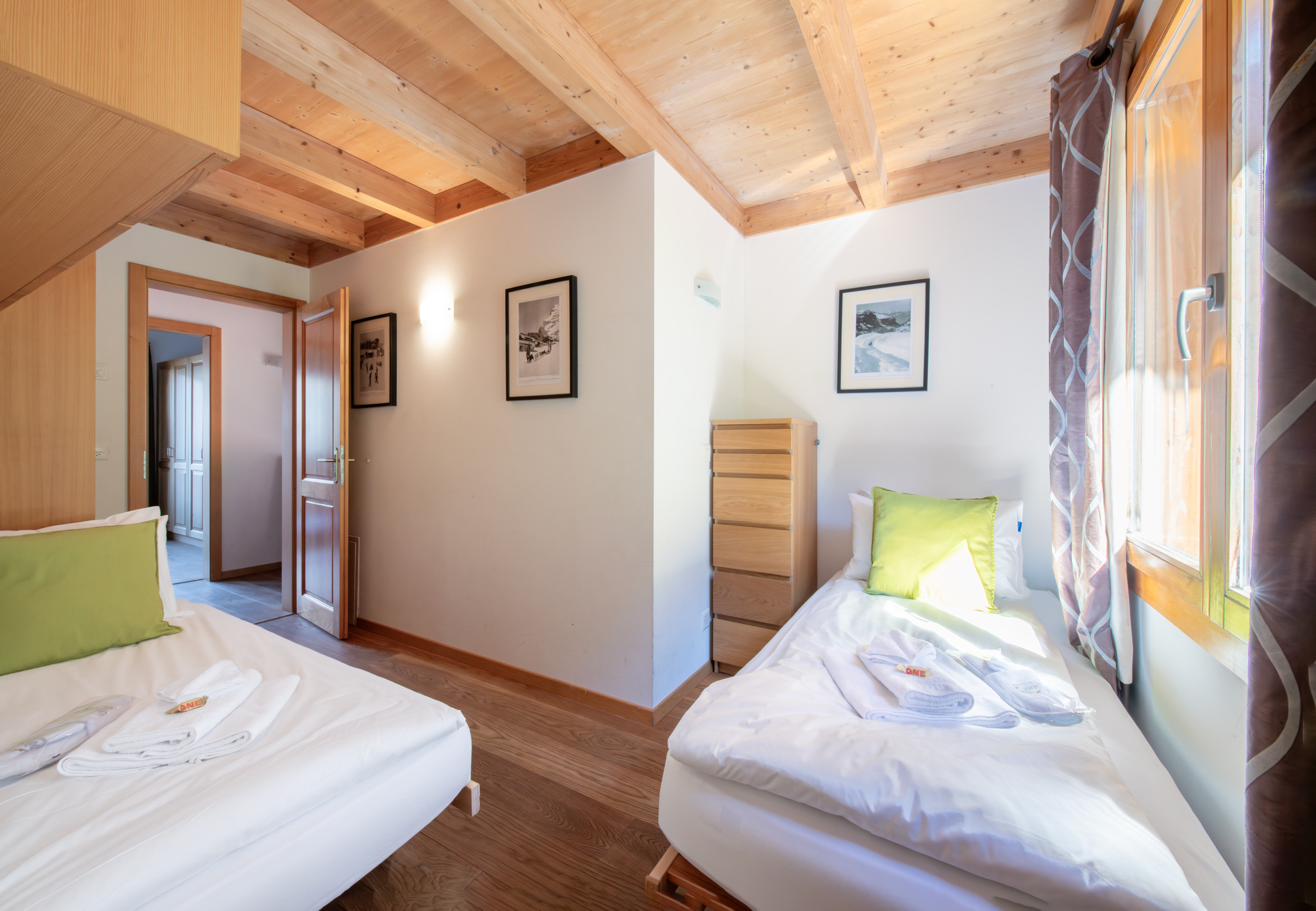 Le premier étage comprend deux chambres à coucher. La principale avec un lit double (180x200 cm), un impressionnant plafond à double hauteur et une salle de bain attenante avec baignoire et la secondaire avec deux lits simples (chacun 90x200cm) et une salle de douche attenante. Au dernier niveau du chalet se trouve une galerie avec deux autres lits simples (chacun 90x200 cm), à laquelle on accède par une échelle en bois.
