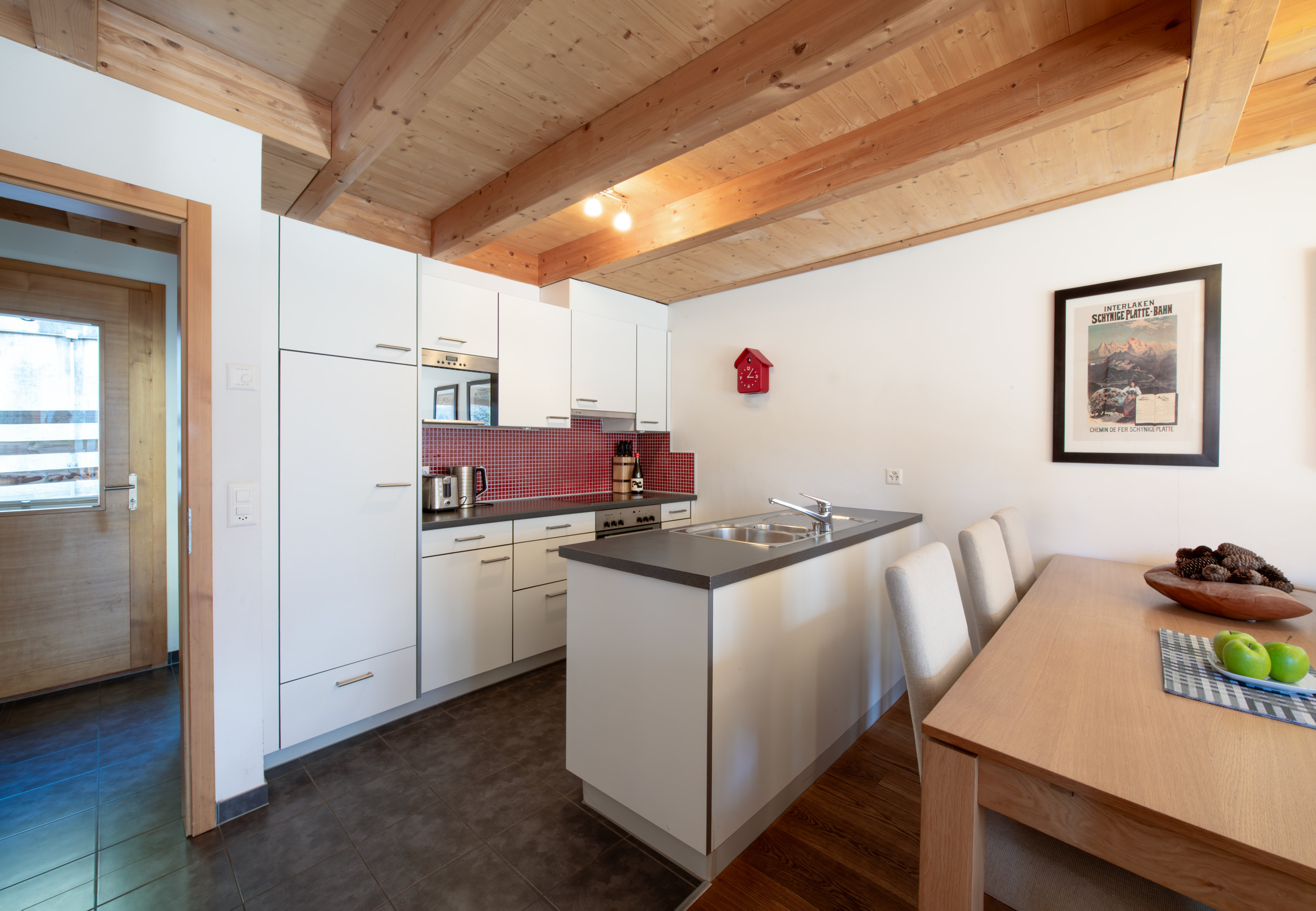La cuisine est entièrement équipée pour préparer les repas au chalet. Elle comprend un four, un micro-ondes, un réfrigérateur, un lave-vaisselle, une plaque de cuisson en céramique, une machine à café Nespresso, une bouilloire, un grille-pain et un service à fondue.