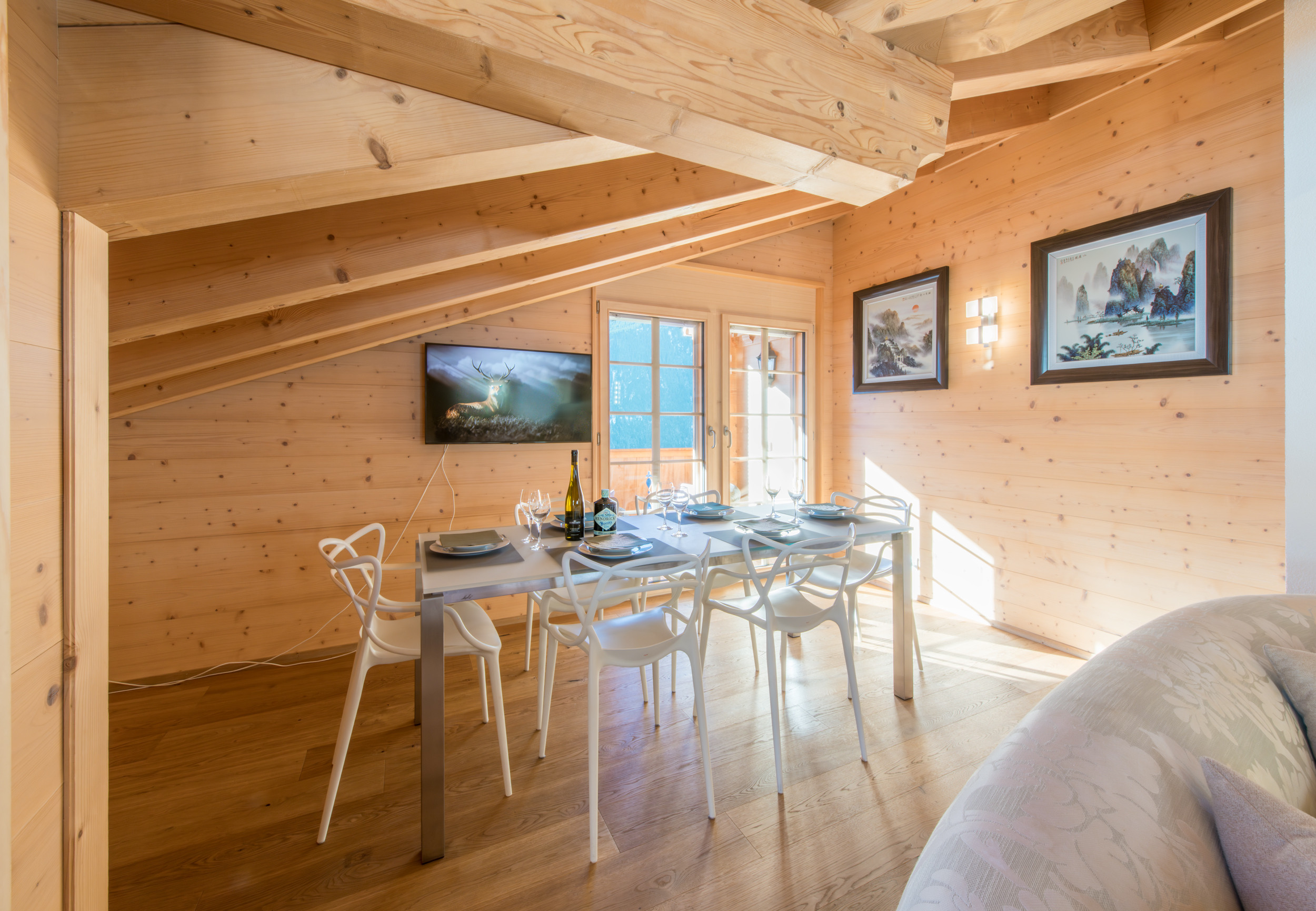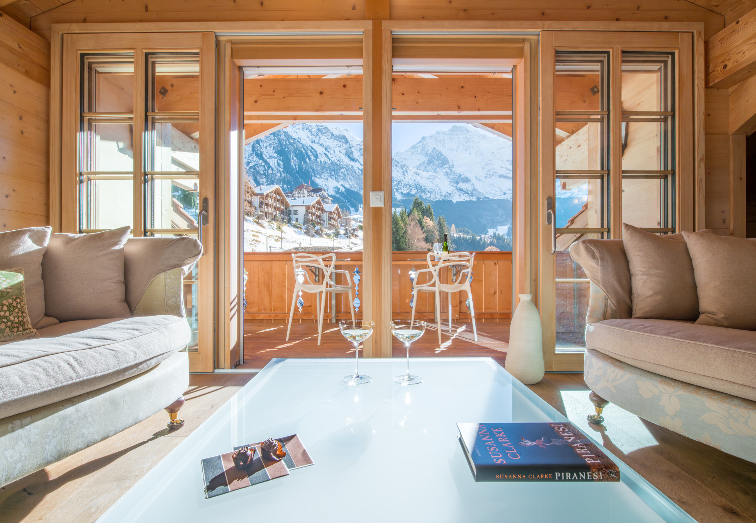 Floor to ceiling windows and sliding doors, traditional wooden beams and high-quality furnishings make this Alpine holiday retreat impressive. Two classical style sofas are central to the living space and the dining space with large glass table and designer chairs is nearest the west facing balcony and is great for entertaining or family meals.