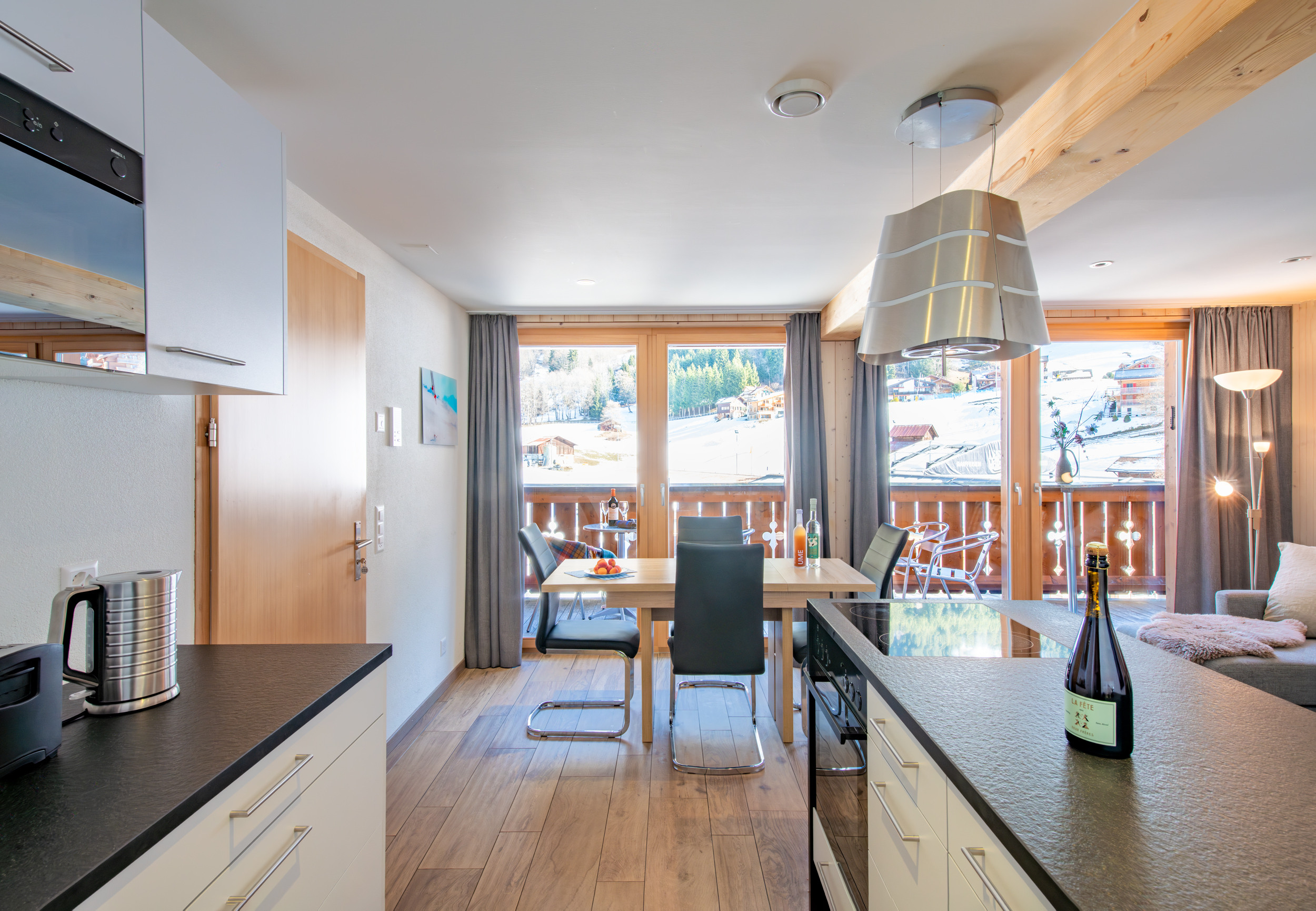 • open plan living-dining-kitchen area features large panoramic windows with views of the Männlichen and Wengen nursery slopes. well equipped kitchen