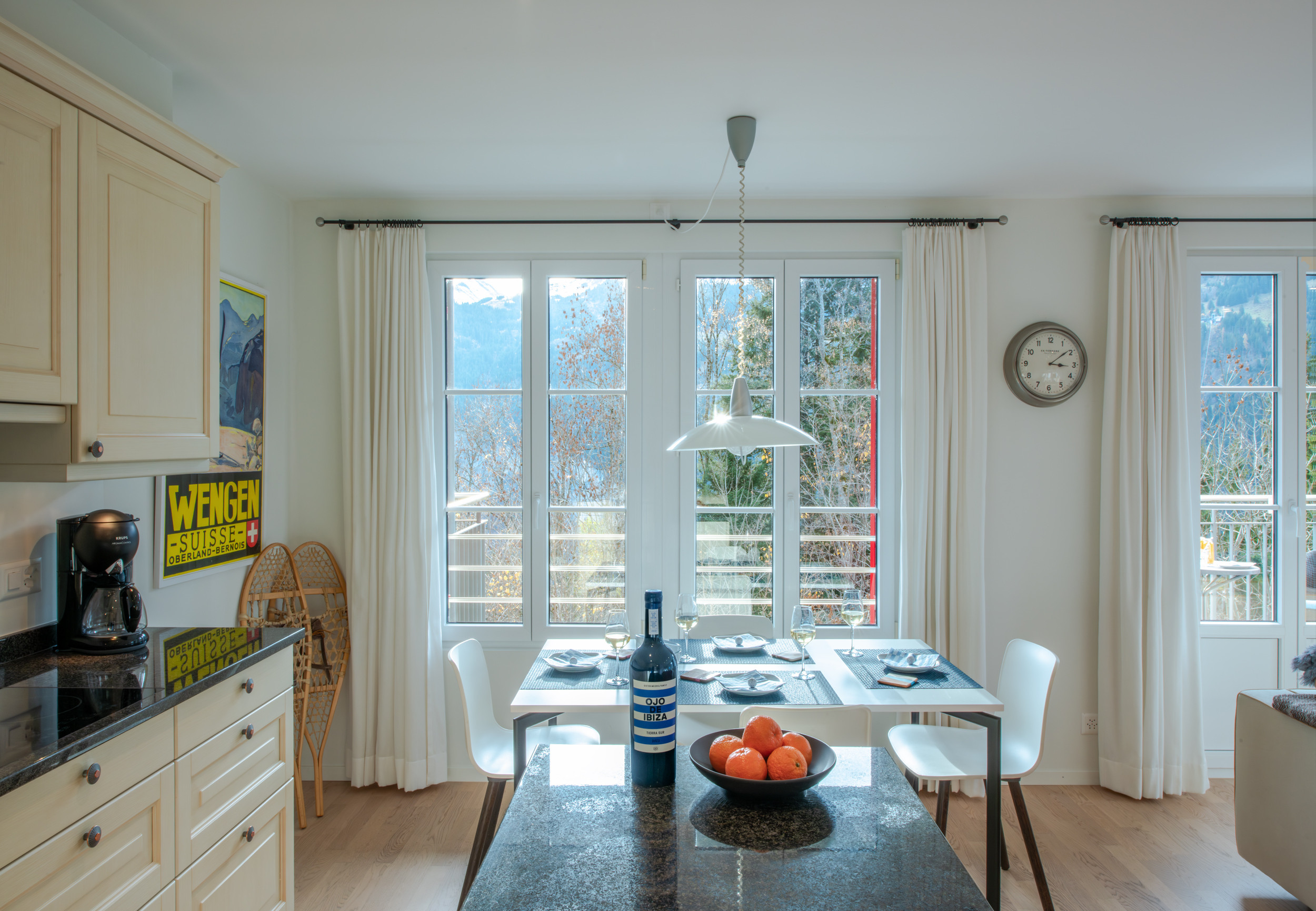 • open plan living-dining-kitchen area features large panoramic windows with views of the Männlichen and Wengen nursery slopes. well equipped kitchen