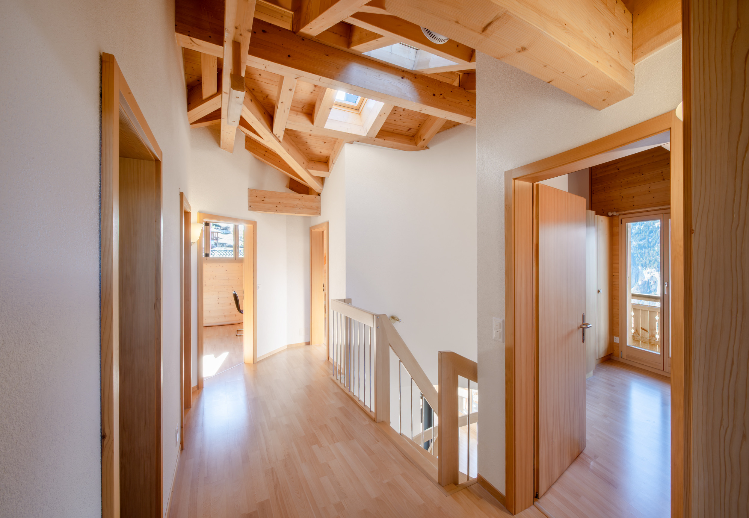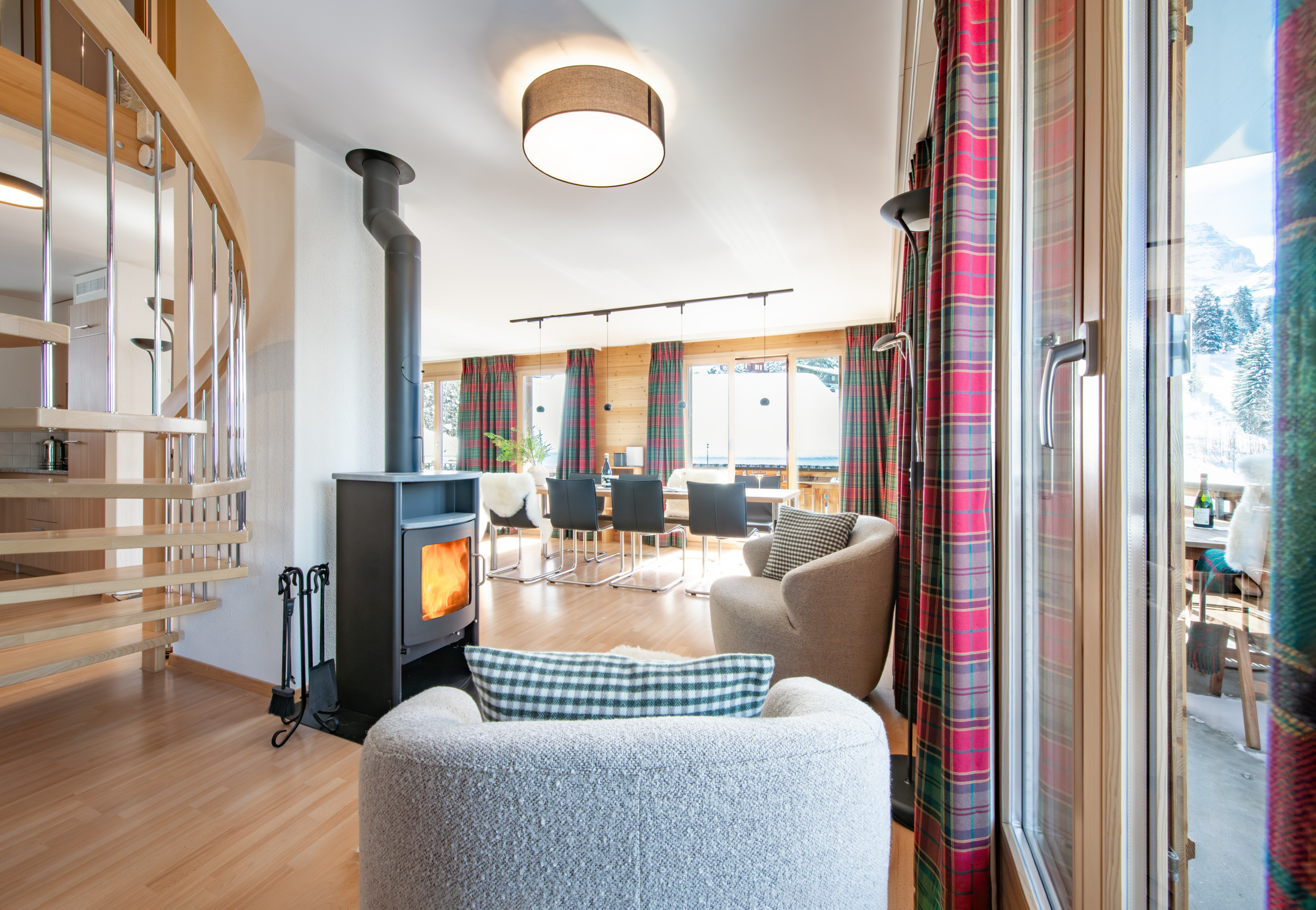 Begin your day with a sunny breakfast around the wood carved table in the well-equipped kitchen-diner with stunning views of the Jungfrau and Silberhorn. This opens out into the living-dining area, which is lovely for gathering after a day out with a comfortable sofa, armchairs and large dining space for entertaining or family dinners. A wood crafted staircase leads up to the gallery with 2 further sofas and TV with DVD player.