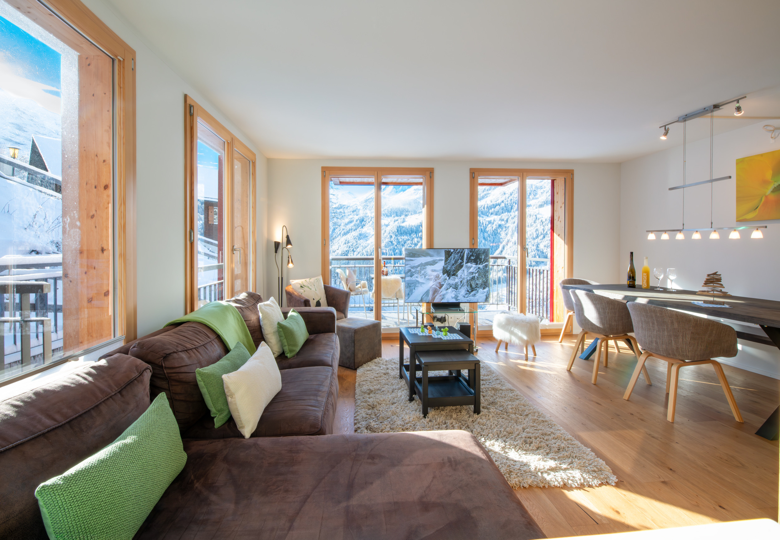 The well-equipped, bright and modern kitchen is great for preparing family meals including coffee machine, fondue set, and raclette. Step out onto the balcony and dine alfresco or make yourself comfortable around the spacious indoor dining table. The living space offers a large comfortable sofa, tv and coffee table for relaxing after a long day out.